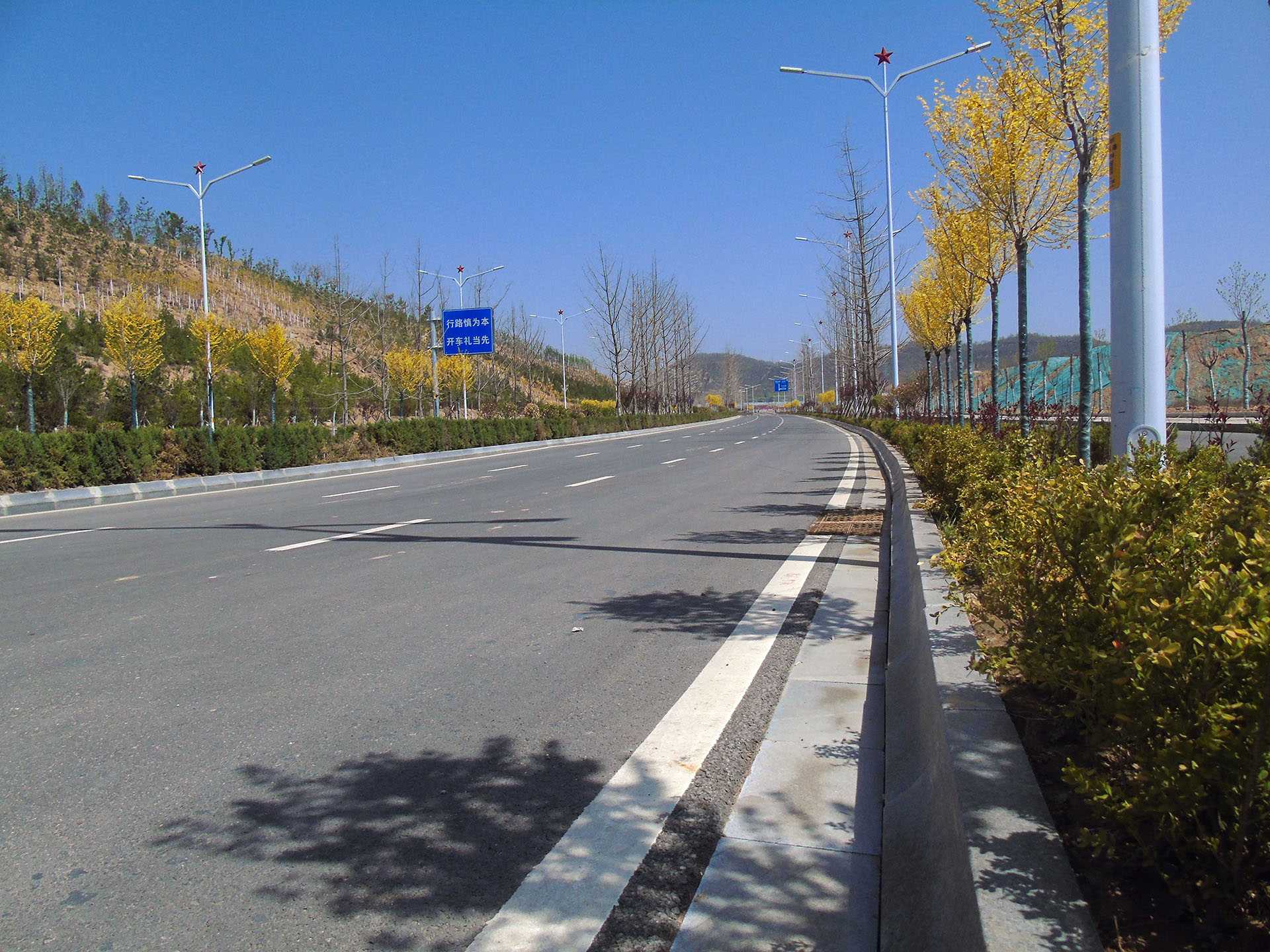 延安新区北区杜家沟道路工程为城市快速路,路线起于杜家沟口处设平交与延大路相接,沿杜家沟布线,终点与新区府前一路(在建)起点相接,路线全长2.848公里。杜家沟道路工程主线采用城市快速路、设计速度60km/h,四幅路,红线宽度66米。其中,主路机动车道双向六车道6×3.5m,路缘带4×0.5m,中央分隔带9m,两侧绿化带2×5m+2×1.5,辅道双向四车道4×3.5m,人行道2×3.5m。路面为沥青混凝土路面,结构层厚度为68cm。