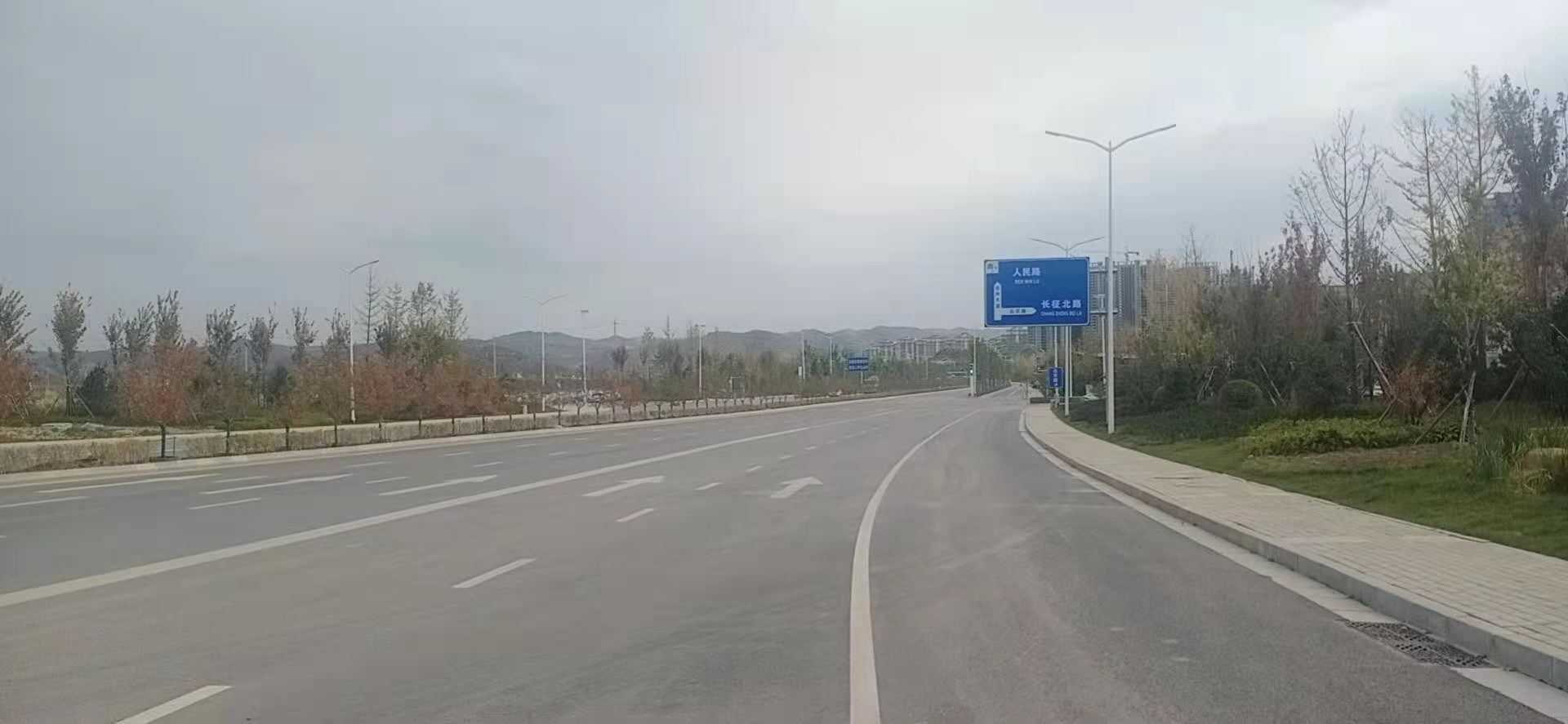 按照设计要求,延安市新区北区7号路路线起于府前二路和杨家岭连接线的平交接口处,终点与杜家沟连接线相接,路线全长0.630公里。该道路等级属于城市主干路、设计速度40km/h,规划红线宽度45m。其中,主路机动车道双向六车道6×3.5m,中央分隔带4m,两侧绿化带2×2m,非机动车道2×3m,人行道2×4.5m。路面结构为沥青混凝土路面,机动车道结构层厚度为68cm,非机动车道40cm。