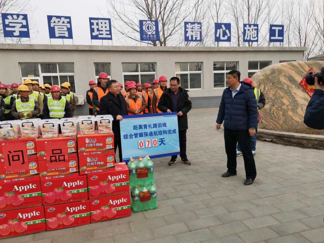 2月19日下午3:30新航城开发公司总经理闫玉波到达项目部,对坚守在一线的施工人员致以节日的问候和良好的祝愿。同时进行了施工倒计时授牌仪式,要求项目部必须在规定的时间节点之前完成青礼路旧线道路及综合管廊保通航工程施工任务。